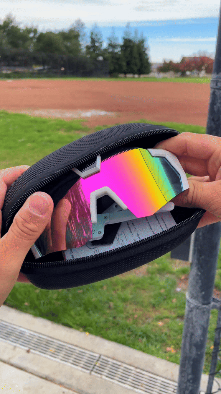 See the game the way you play it. These POV baseball glasses cost visibility with a rainbow-mirrored lens while the built-in camera captures every swing, catch and highlight. Perfect for practices, game days, and creating clean POV clips for Instagram & TikTok.